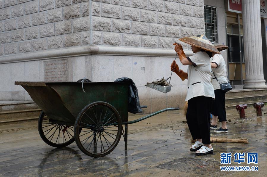 7月8日,在湖南省吉首市,环卫工人在现场清淤。 当日,湖南省湘西土家族苗族自治州吉首市出现强降雨天气,部分道路积水形成内涝,环卫等部门对积水路段开展排水、清淤工作。 新华社发(陈振海 摄)
