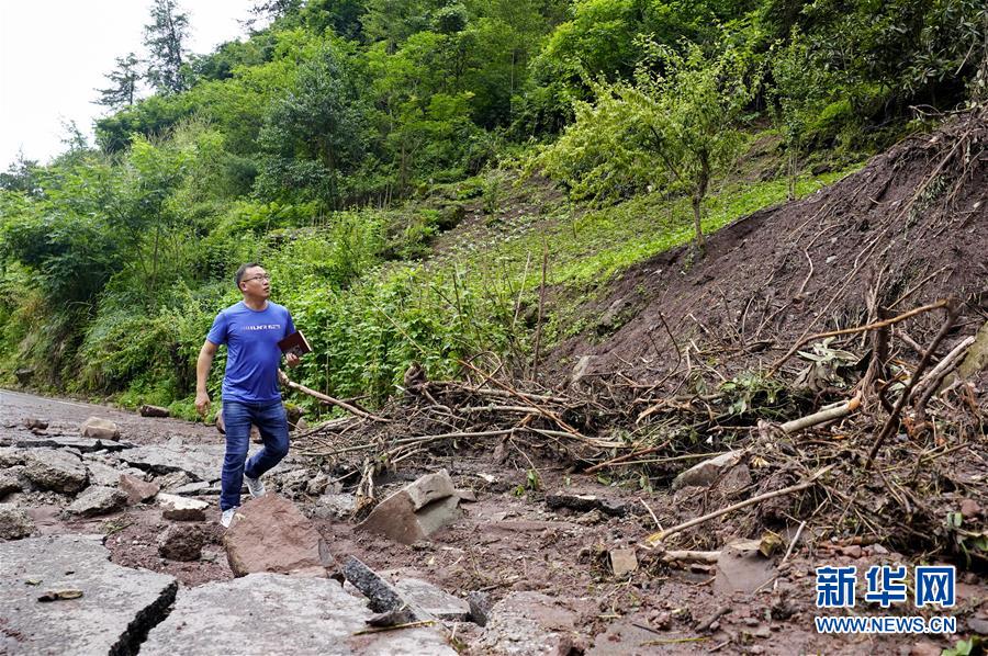 7月7日,中益乡华溪村驻村第一副书记罗风华在华溪村一处因暴雨造成的滑坡点进行巡查。 新华社记者 刘潺 摄