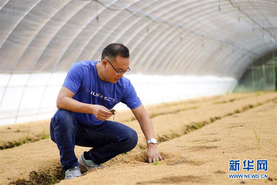 7月7日下午,中益乡华溪村驻村第一副书记罗风华在村里的黄精育苗大棚内查看黄精苗的长势。 新华社记者 刘潺 摄
