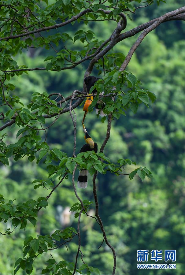 双角犀鸟“夫妇”停留在巢穴附近的树枝上(7月5日摄)。新华社发(朱边勇 摄)