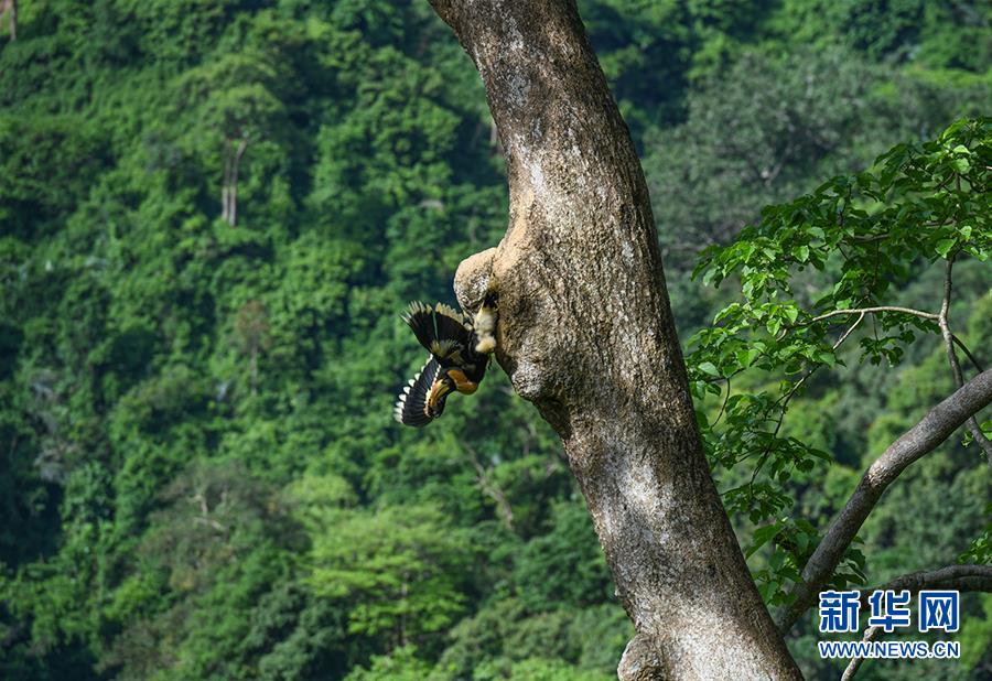 双角犀鸟雏鸟从巢穴中飞出来(7月6日摄)。新华社发(朱边勇 摄)