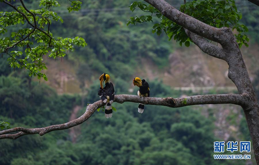 双角犀鸟“夫妇”停留在巢穴附近的树枝上(7月4日摄)。新华社发(朱边勇 摄)