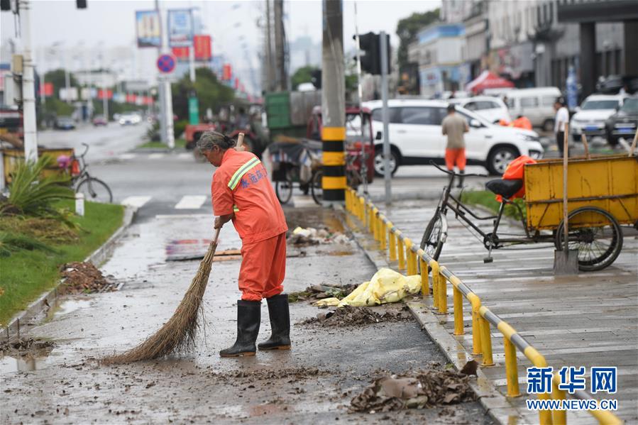 7月8日,环卫工人在歙县街道上清扫。新华社记者 张端 摄