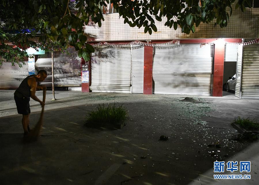 7月9日凌晨,在广汉市南丰镇元盛村,一位村民在清扫地上的碎玻璃渣。 7月8日晚,四川省广汉市南丰镇元盛村一花炮厂发生火灾并引发的爆炸事故,已导致6人受伤,其中2人重伤,4人轻伤。事故原因正在调查中。 新华社记者 王曦 摄