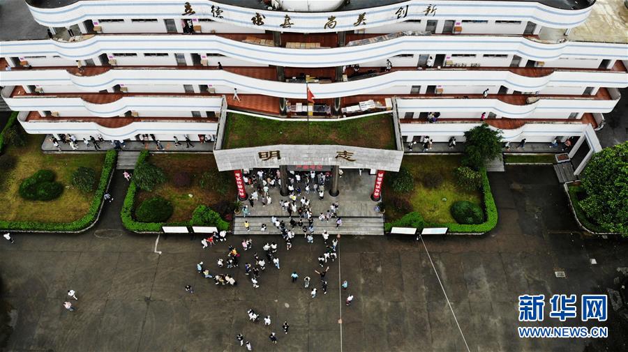 7月9日,考生进入歙县第二中学考点(无人机照片)。 受强降雨影响,2020年高考安徽歙县考区7月7日未能如期开考,经研究并报教育部批准,歙县考区于9日启用2020年普通高等学校招生全国统一考试语文、数学(文、理)科目副题进行考试。 新华社记者 黄博涵 摄