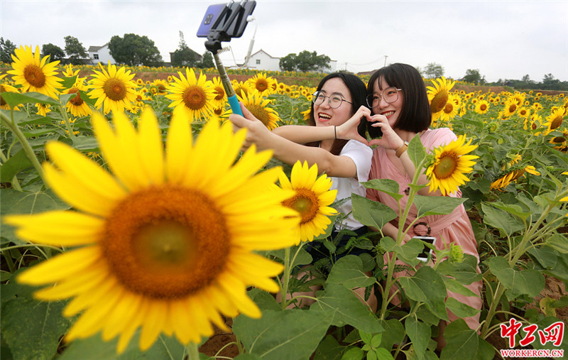 2020年7月9日,盛夏时节,江苏省扬州市仪征市新集镇凌东村的向日葵花竞相开放,金黄艳丽的葵花像一张张“笑脸”迎风摇曳,在田野间形成了美丽的芬芳画卷,金色的花海吸引游客前来观赏。孟德龙/视觉中国