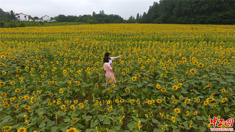 2020年7月9日,盛夏时节,江苏省扬州市仪征市新集镇凌东村的向日葵花竞相开放,金黄艳丽的葵花像一张张“笑脸”迎风摇曳,在田野间形成了美丽的芬芳画卷,金色的花海吸引游客前来观赏。孟德龙/视觉中国