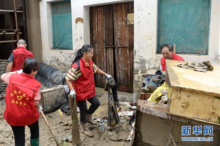 7月9日,安徽省歙县的社区志愿者帮助居民进行灾后清理。 近日,受强降雨影响,安徽省歙县城区遭遇内涝灾害,部分地区受灾严重。目前,城区积水退去,当地政府部门组织消防人员、社区志愿者、环卫工人等清淤排险,积极开展生产自救和灾后恢复工作。 新华社记者 黄博涵 摄