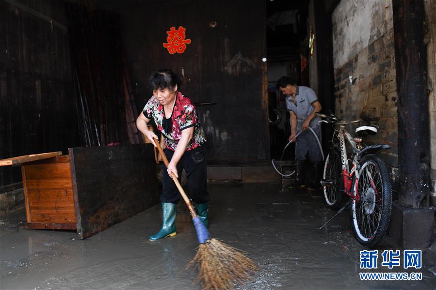 7月9日,安徽省歙县渔梁街的居民在进行灾后清理。 近日,受强降雨影响,安徽省歙县城区遭遇内涝灾害,部分地区受灾严重。目前,城区积水退去,当地政府部门组织消防人员、社区志愿者、环卫工人等清淤排险,积极开展生产自救和灾后恢复工作。 新华社记者 张端 摄