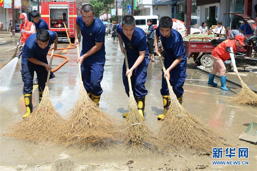 7月9日,安徽省歙县的消防人员和社区志愿者在灾后清理路面。 近日,受强降雨影响,安徽省歙县城区遭遇内涝灾害,部分地区受灾严重。目前,城区积水退去,当地政府部门组织消防人员、社区志愿者、环卫工人等清淤排险,积极开展生产自救和灾后恢复工作。 新华社记者 黄博涵 摄