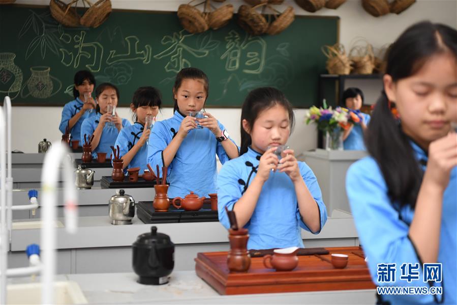 7月9日,沩山乡九年制学校茶艺班的学生在教室里练习茶艺。新华社记者 薛宇舸 摄