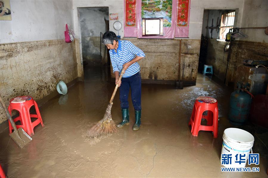 7月8日,在黄山市徽州区洽舍乡张村村,村民在清理房屋内的淤泥。 新华社记者 周牧 摄