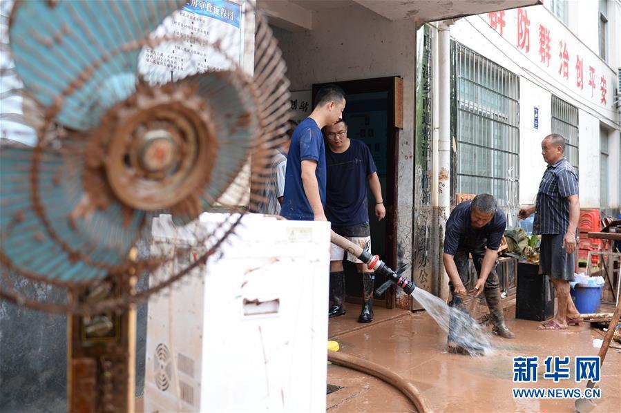 7月9日,在泸溪县白羊溪乡,工作人员在清淤。新华社发(陈振海摄)