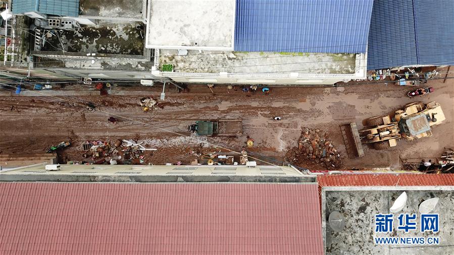 7月9日,在泸溪县白羊溪乡,人们在清淤(无人机照片)。新华社发(陈振海摄)