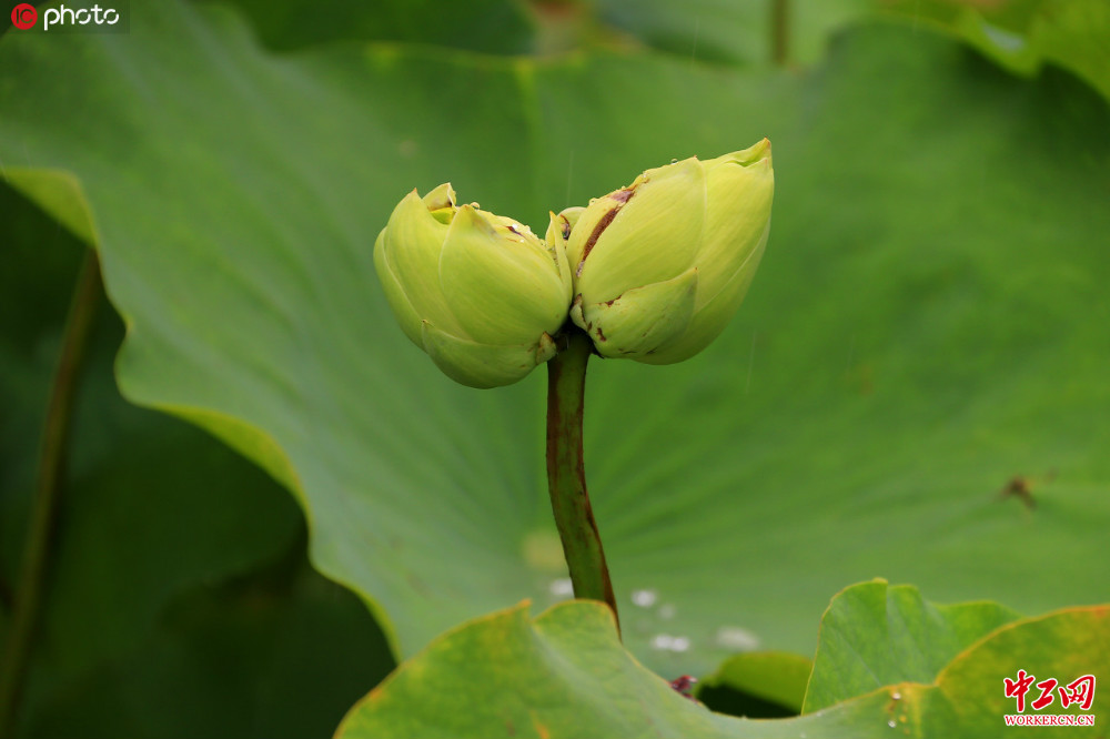 2020年7月9日,北京,圆明园荷花基地中的一株并蒂莲含苞待放。/IC photo