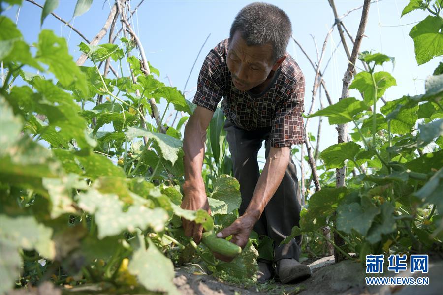 7月8日,黑龙江省林甸县宏伟乡全胜村脱贫户范玉林在自家园子里摘黄瓜。通过县里组织帮扶,他家采摘的第一批黄瓜已经进入县里的超市销售。 地处大兴安岭南麓集中连片特困地区的黑龙江省林甸县,近年把发展庭院经济作为促进贫困群众脱贫增收的重要路径,引导鼓励农民在自家“小菜园”发展特色种植、养殖,将“小菜园”变成“增收田”。目前,全县共落实庭院种养殖14000余户,其中贫困户3000余户。 新华社记者 王建威 摄