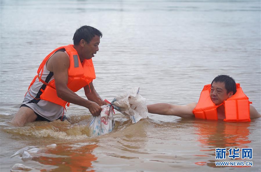 7月9日,为应对洪峰到来,邵忠如(左)在水中加固圩堤。新华社记者 万象 摄