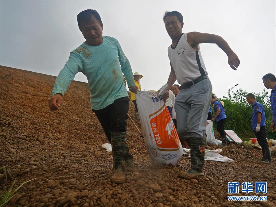 7月9日,邵忠如(前右)和村民们运送沙袋,封堵圩堤上的泡泉。新华社记者 万象 摄