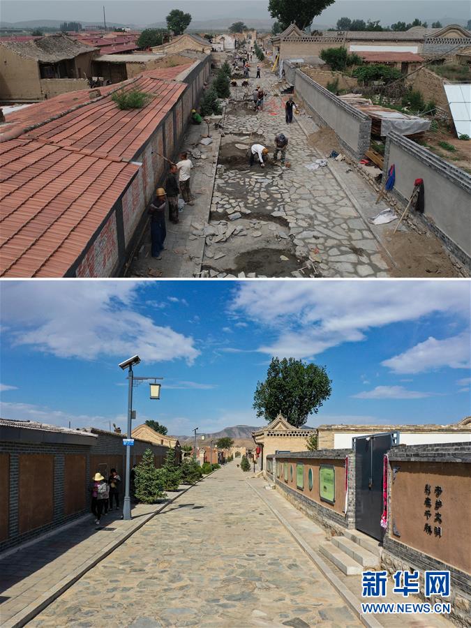 拼版照片:上图为2018年6月26日拍摄的涧西村内正在整修的街道(资料照片);下图为5月28日无人机拍摄的涧西村内的街道(新华社记者曹阳摄)。 新华社发