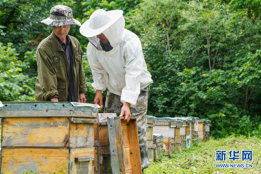 齐光磊(右)与父亲齐传君在蜂场查看黑蜂饲养情况(7月9日摄)。 新华社记者 李建平 摄