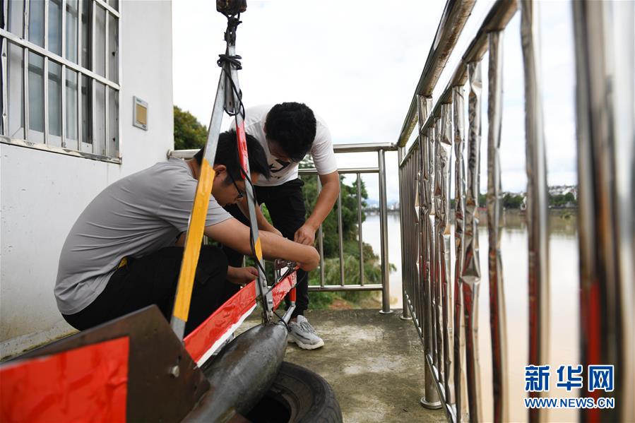 7月9日,在安徽省歙县渔梁水文站,李佳(右)和同事在调试流速仪准备进行水文勘测。 新华社记者 张端 摄