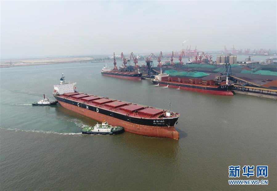 7月10日,一艘轮船在拖轮的协助下向唐山港京唐港区煤炭码头靠泊(无人机照片)。新华社记者 杨世尧 摄