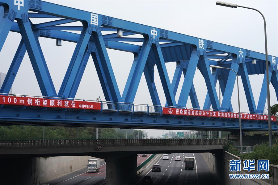 7月10日拍摄的京沈客专跨五环路大桥。 当日,由中铁六局承建的京沈客专跨五环路大桥精准就位。该工程为京沈客专北京段控制性工程,位于北京东北五环,采用钢桁梁桥上跨五环路,桥长100米,高13米,重1896吨。之后,大桥将进入桥面混凝土铺装层施工阶段。 新华社记者 邢广利 摄