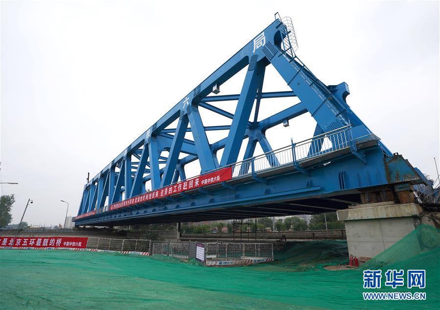 7月10日拍摄的京沈客专跨五环路大桥。 当日,由中铁六局承建的京沈客专跨五环路大桥精准就位。该工程为京沈客专北京段控制性工程,位于北京东北五环,采用钢桁梁桥上跨五环路,桥长100米,高13米,重1896吨。之后,大桥将进入桥面混凝土铺装层施工阶段。 新华社记者 邢广利 摄