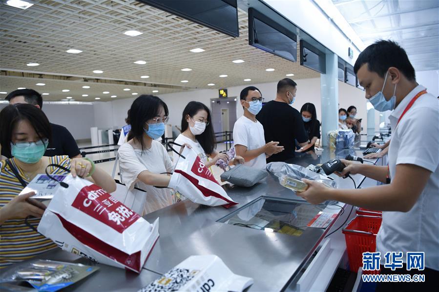 7月10日,顾客在三亚凤凰国际机场新增离岛免税提货点办理提货业务。 新华社发(沙晓峰 摄)