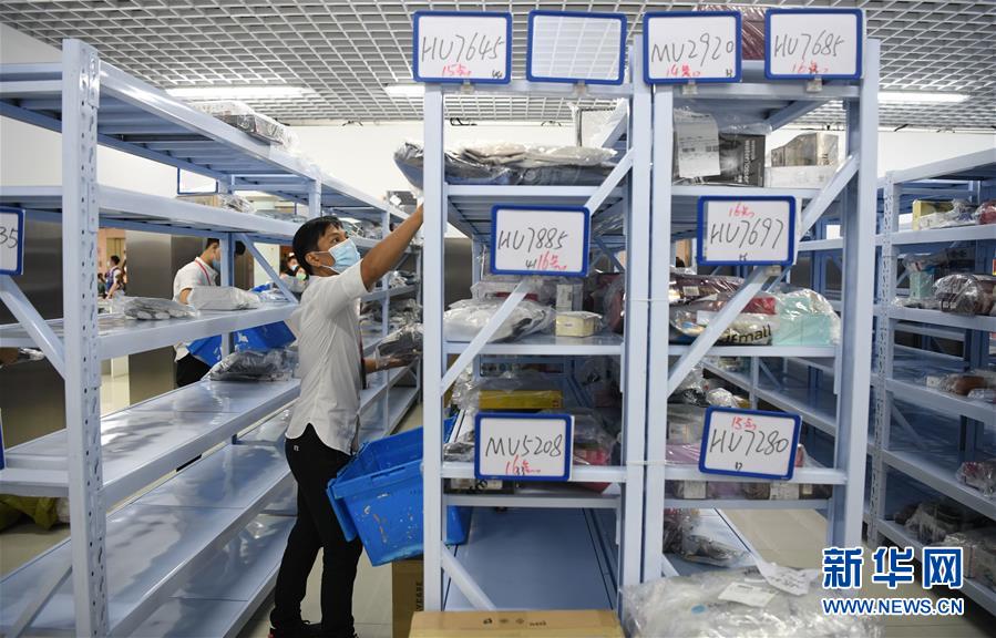 7月10日,工作人员在三亚凤凰国际机场新增离岛免税提货点清点免税商品。 新华社发(沙晓峰 摄)