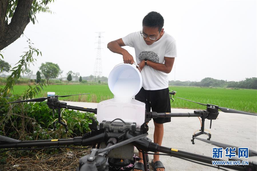 7月10日,八里店镇尹家圩粮油植保农机专业合作社负责人孙建龙给植保无人机添加化肥。 近日,浙江湖州吴兴区八里店镇尹家圩粮油植保农机专业合作社聘请技术人员,使用植保无人机对3300余亩水稻进行施肥作业。据了解,该合作社今年首次全面启用智能化农业技术和设备进行播种、施肥、喷药等作业,既提高了管护效率,又降低了生产成本。 新华社记者 黄宗治 摄