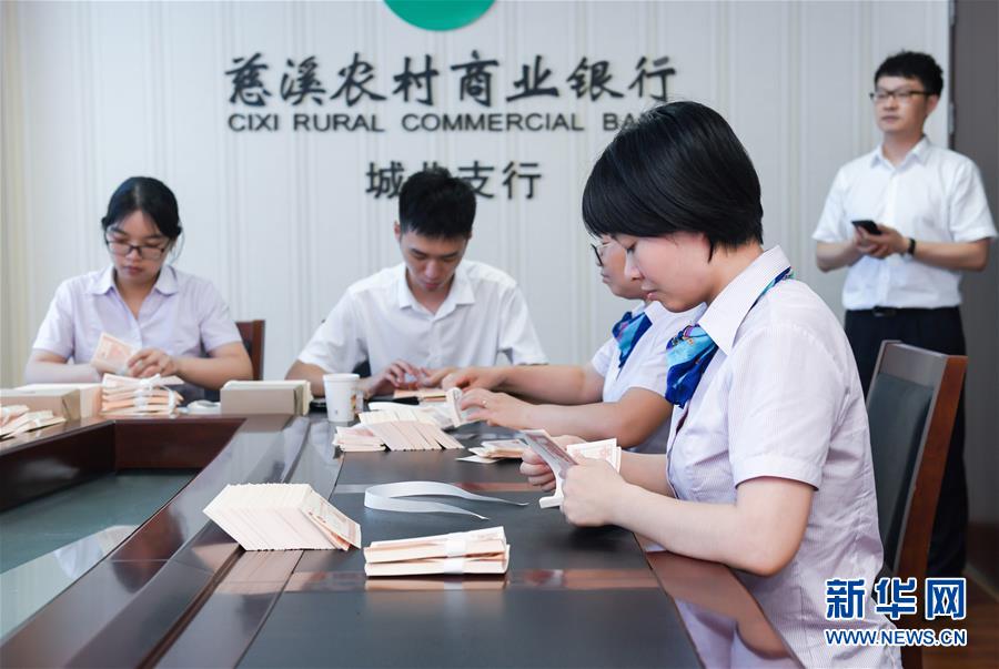 7月10日,慈溪农村商业银行组织职工进行点钞技能竞赛。 新华社记者 徐昱 摄