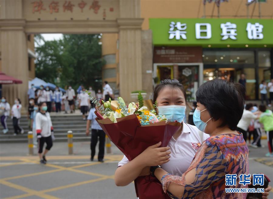 7月10日,在北京市陈经纶中学考点,家长为考生送上鲜花。 当日下午,北京2020年高考结束。今年北京高考时间为7月7日至10日。 新华社记者 彭子洋 摄