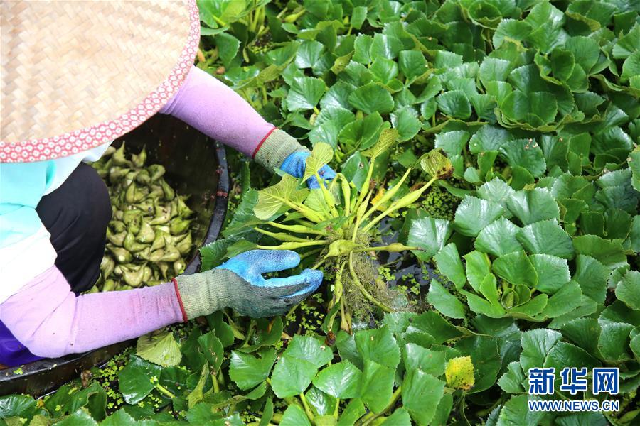 7月10日,江苏省泰州市姜堰区溱潼镇湖滨村村民划着菱桶采摘菱角。 泰州市姜堰区溱潼镇地处江苏里下河地区,近日这里种植的菱角陆续进入成熟季,村民划着菱桶在水面采菱,构成水乡独特的丰收图景。 新华社发(顾俊 摄)