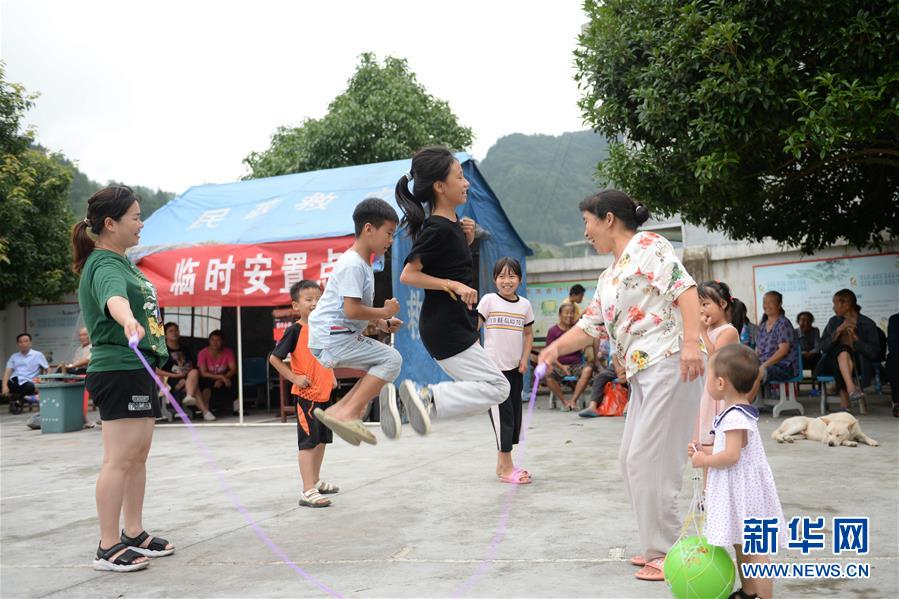 7月10日,小朋友在泸溪县解放岩乡临时安置点玩耍。新华社发(陈振海 摄)