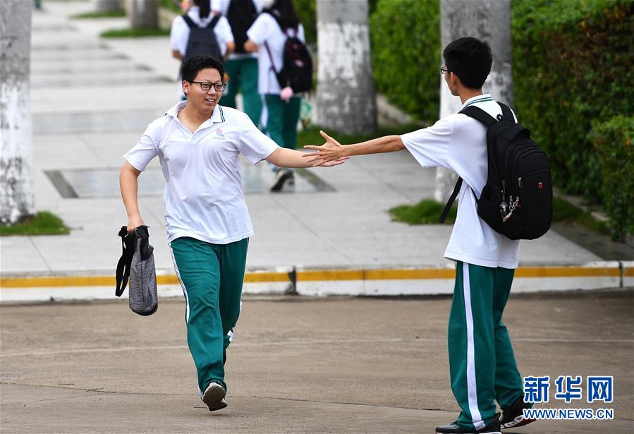 7月10日,在海南华侨中学(高中部)考点,考生在考试结束后与同学击掌庆祝。 当日,为期4天的海南2020年高考结束。 新华社记者 郭程 摄