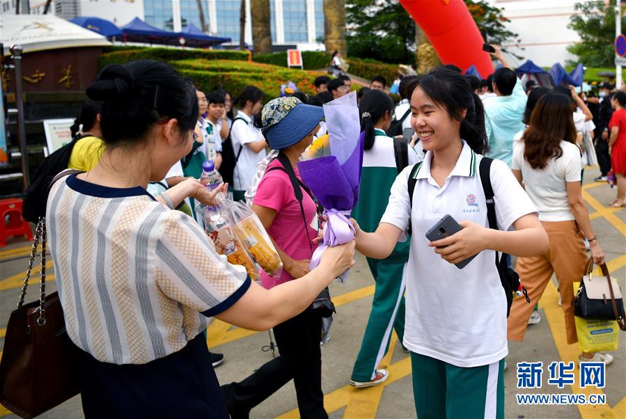 7月10日,在海南华侨中学(高中部)考点,考生接过家长手中的鲜花。 当日,为期4天的海南2020年高考结束。 新华社记者 郭程 摄