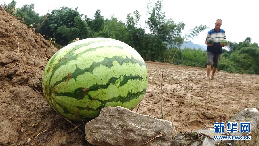 7月10日,在闽江上游富屯溪沿线福建省顺昌县双溪街道下沙村,一位村民在被冲毁的西瓜地里捡拾未被洪水冲走的西瓜。 新华社发(陈柏材 摄)