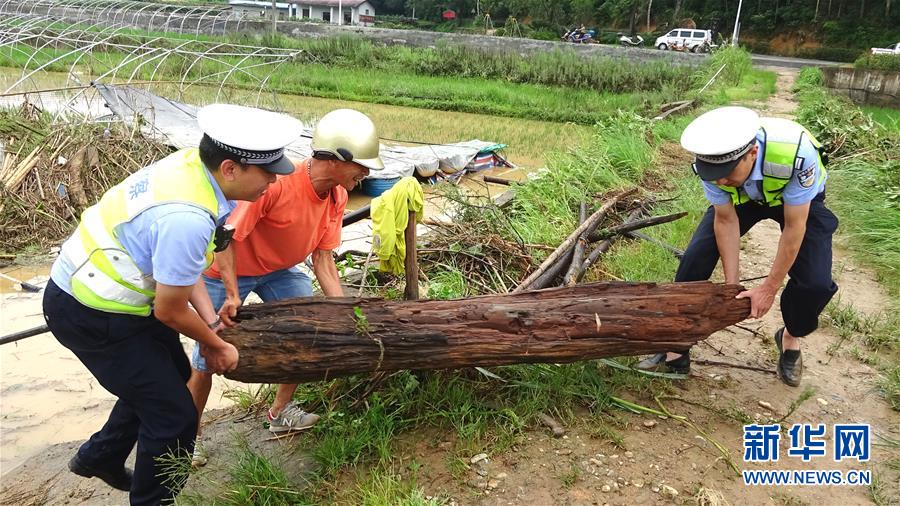 7月10日,在闽江上游富屯溪沿线福建省顺昌县双溪街道下沙村,顺昌县公安局交警大队民警帮助村民清理垃圾。 新华社发(陈柏材 摄)