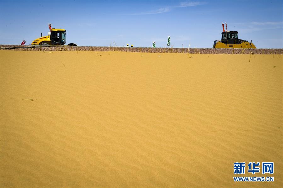 7月10日,工人在位于宁夏境内的乌玛高速青铜峡至中卫段A10标段施工。 盛夏时节,位于宁夏境内的乌玛(内蒙古乌海市至青海玛沁县)高速青铜峡至中卫段正在抓紧施工建设。该路段主线全长122.9公里,其中穿越腾格里沙漠腹地的18公里公路是宁夏建设的首条沙漠高速公路,预计2021年建成通车。 新华社记者 冯开华 摄