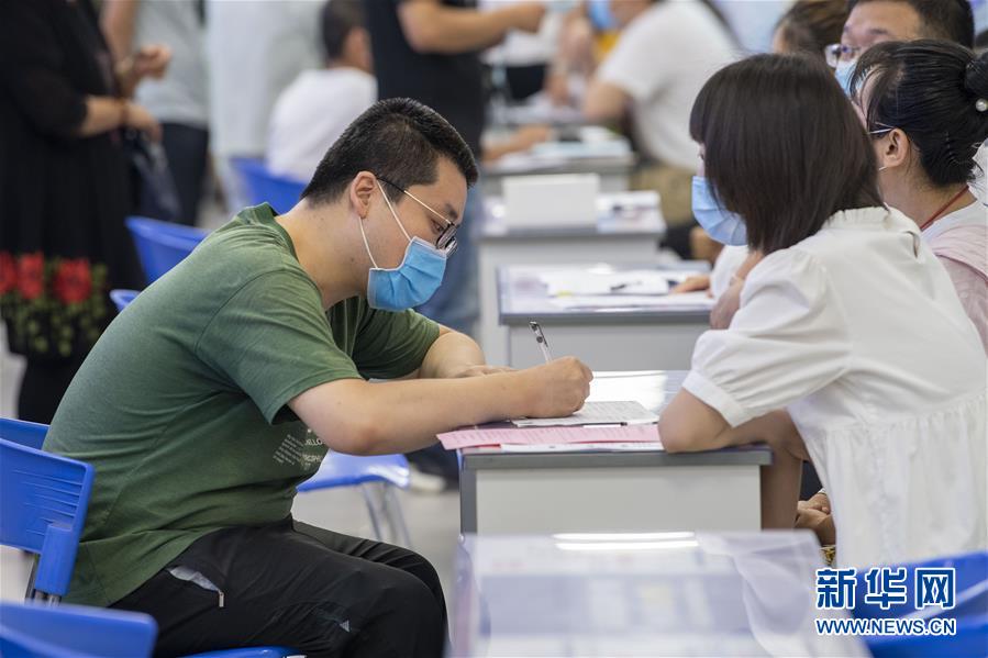 7月11日,在太原人才大市场,求职者填写信息登记表。 当日,山西太原人才大市场举办招聘会,来自教育、医药、互联网等多个行业的200余家企业提供超过6000个工作岗位,吸引大量求职者前来应聘。 新华社记者 杨晨光摄