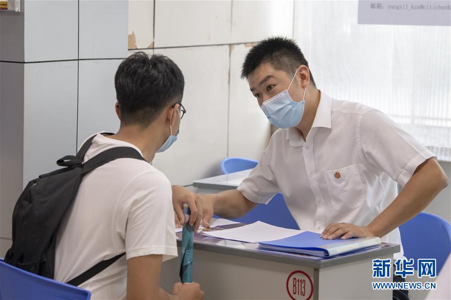 7月11日,在太原人才大市场,用人单位工作人员(右)与求职者交流。 当日,山西太原人才大市场举办招聘会,来自教育、医药、互联网等多个行业的200余家企业提供超过6000个工作岗位,吸引大量求职者前来应聘。 新华社记者 杨晨光摄