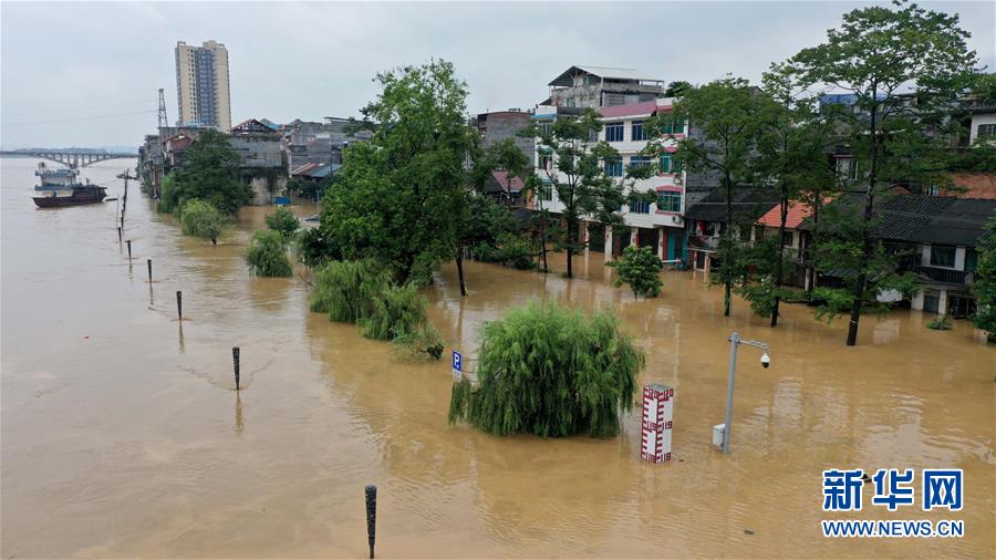 广西融安县城发生内涝(7月11日摄,无人机照片)。 受持续强降雨影响,广西融江水位暴涨。 新华社记者 张爱林 摄
