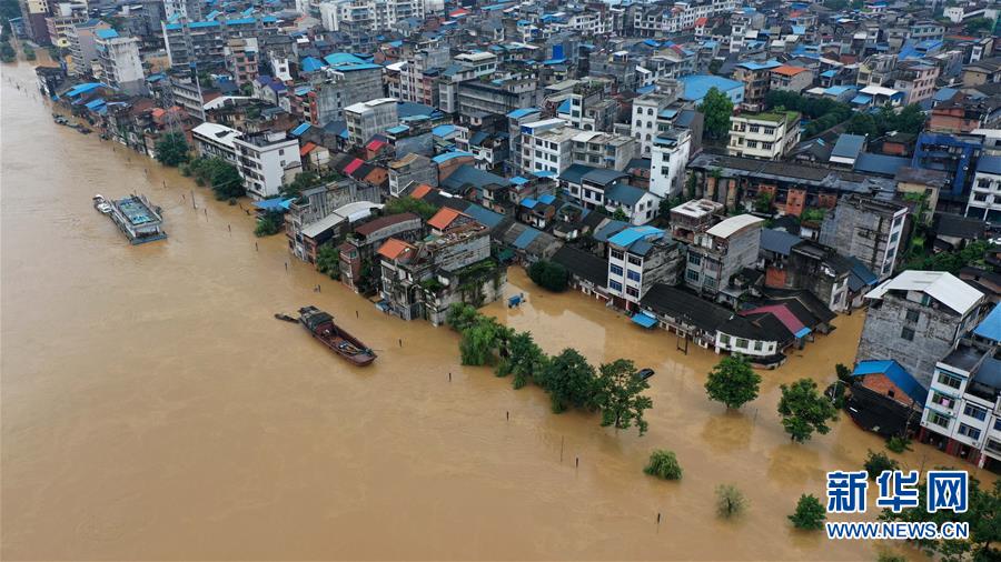 这是融江融安段的洪水(7月11日摄,无人机照片)。 受持续强降雨影响,广西融江水位暴涨。 新华社记者 张爱林 摄