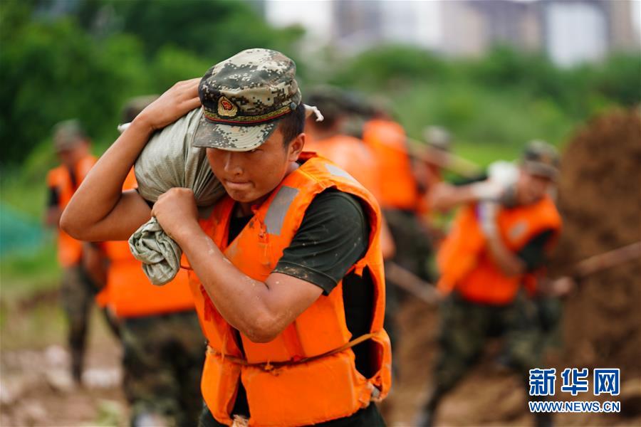 7月11日,武警战士在鄱阳县鄱阳镇江家岭村搬运沙袋。新华社记者 周密 摄