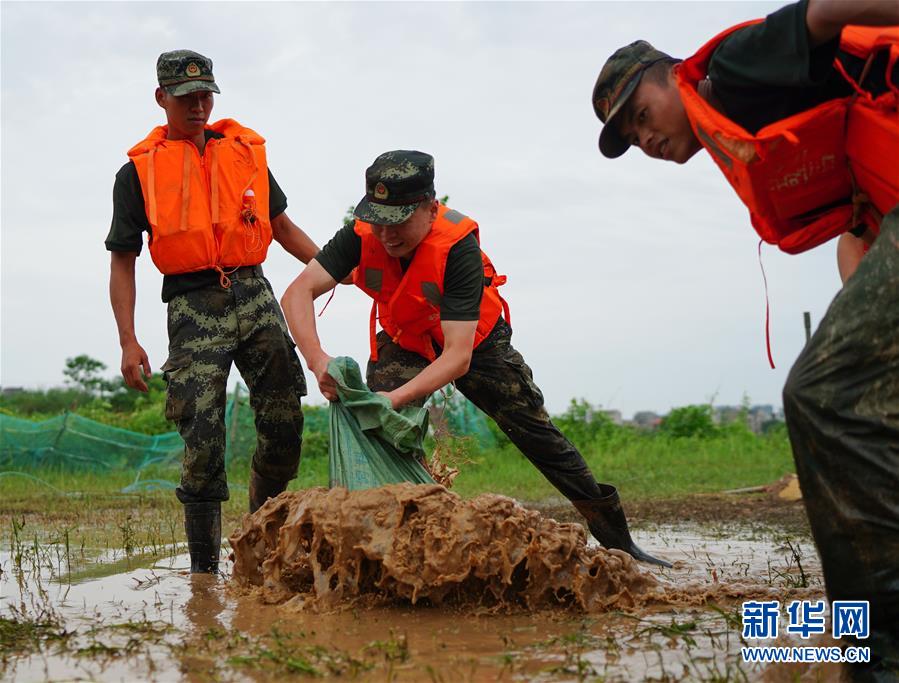 7月11日,武警战士在鄱阳县鄱阳镇江家岭村搬运沙袋。 新华社记者 周密 摄