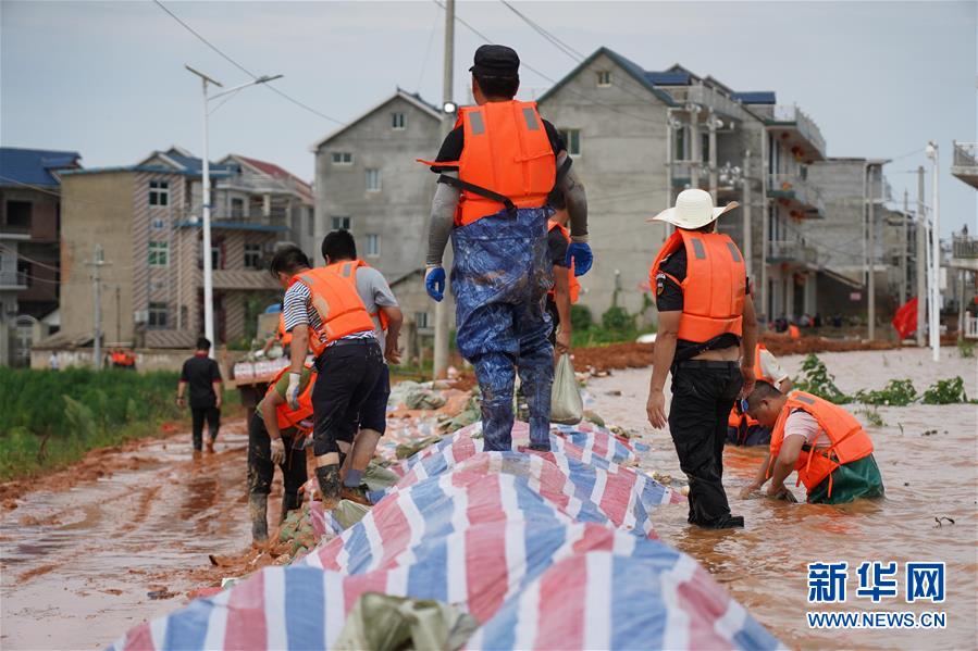 7月11日,在鄱阳县鄱阳镇江家岭村,来自鄱阳县城管局的党员干部在堤坝上给防水墙铺设防水布,防止河水侵蚀墙体。 新华社记者 张浩波 摄
