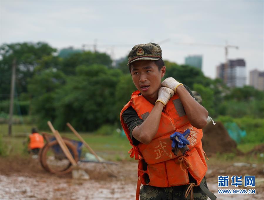 7月11日,一名武警战士在鄱阳县鄱阳镇江家岭村搬运沙袋。 新华社记者 张浩波 摄