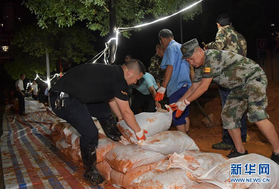 7月11日,在江西省庐山市内,当地干部群众正在连夜奋战,用沙袋构筑子堤。 受连续降雨及长江来水共同影响,鄱阳湖水位持续快速上涨。7月11日21时,鄱阳湖星子站水位22.48米,逼近22.52米的历史最高水位。在江西省庐山市内,当地干部群众连夜奋战,在城防堤内构筑2.5公里长的子堤,进一步做好防汛工作。 新华社记者 彭昭之 摄