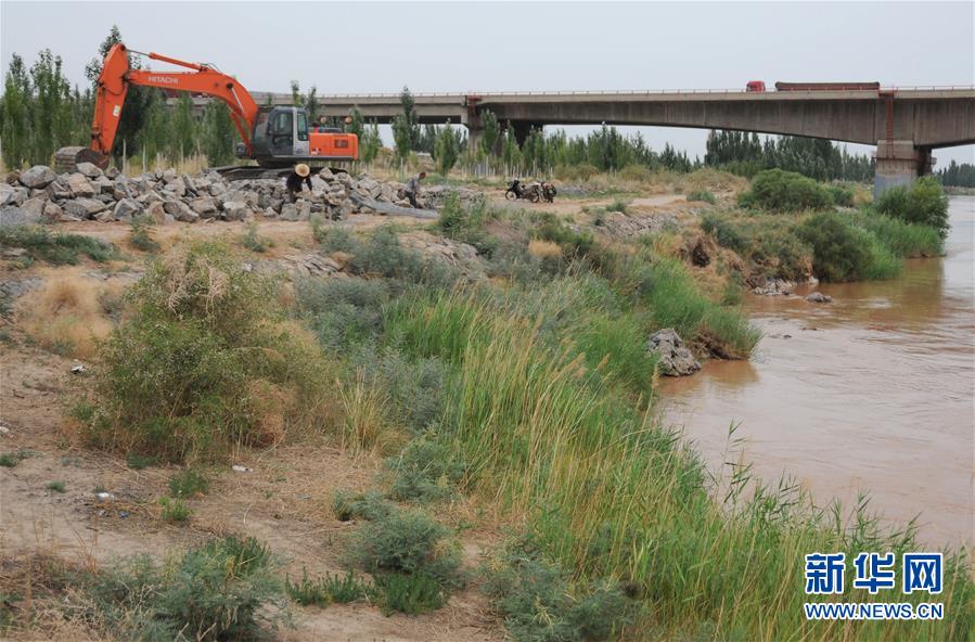 7月11日,工人在黄河内蒙古磴口段南套子险工段进行除险加固。 新华社记者 李云平 摄